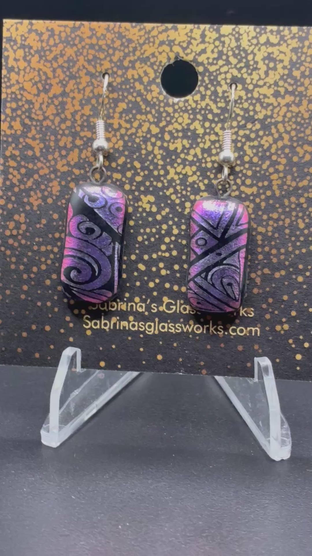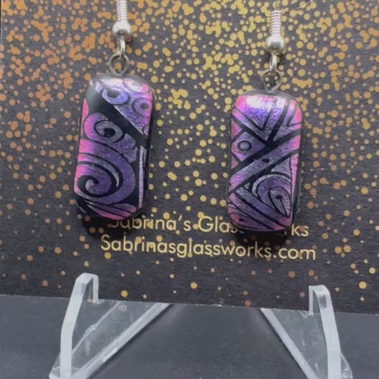 These earrings are a striking pair of handcrafted dichroic glass dangles that beautifully blend artistry and shimmer. Each rectangular piece features a luminous color shift from deep violet to magenta with a subtle metallic sparkle that catches the light from every angle. The surfaces are decorated with bold black abstract linework—swirls, curves, and geometric shapes—that give the design a modern, almost tribal or cosmic feel. Each pair hangs from sterling silver French hooks. Colors will vary due to the nature of Dichroic glass.