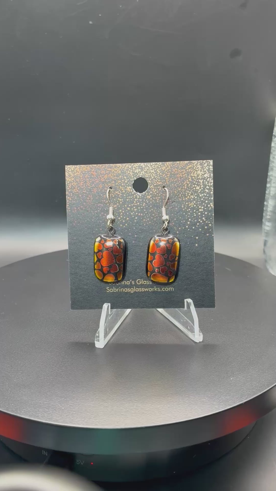 These earrings are striking dichroic glass drops featuring a warm, fiery color palette of deep amber, copper, and molten red. The surface pattern is a lively mosaic of scattered heart shapes, glowing with metallic brilliance against a sleek black background. The effect is reminiscent of glowing embers or molten metal—radiant, dimensional, and full of energy.