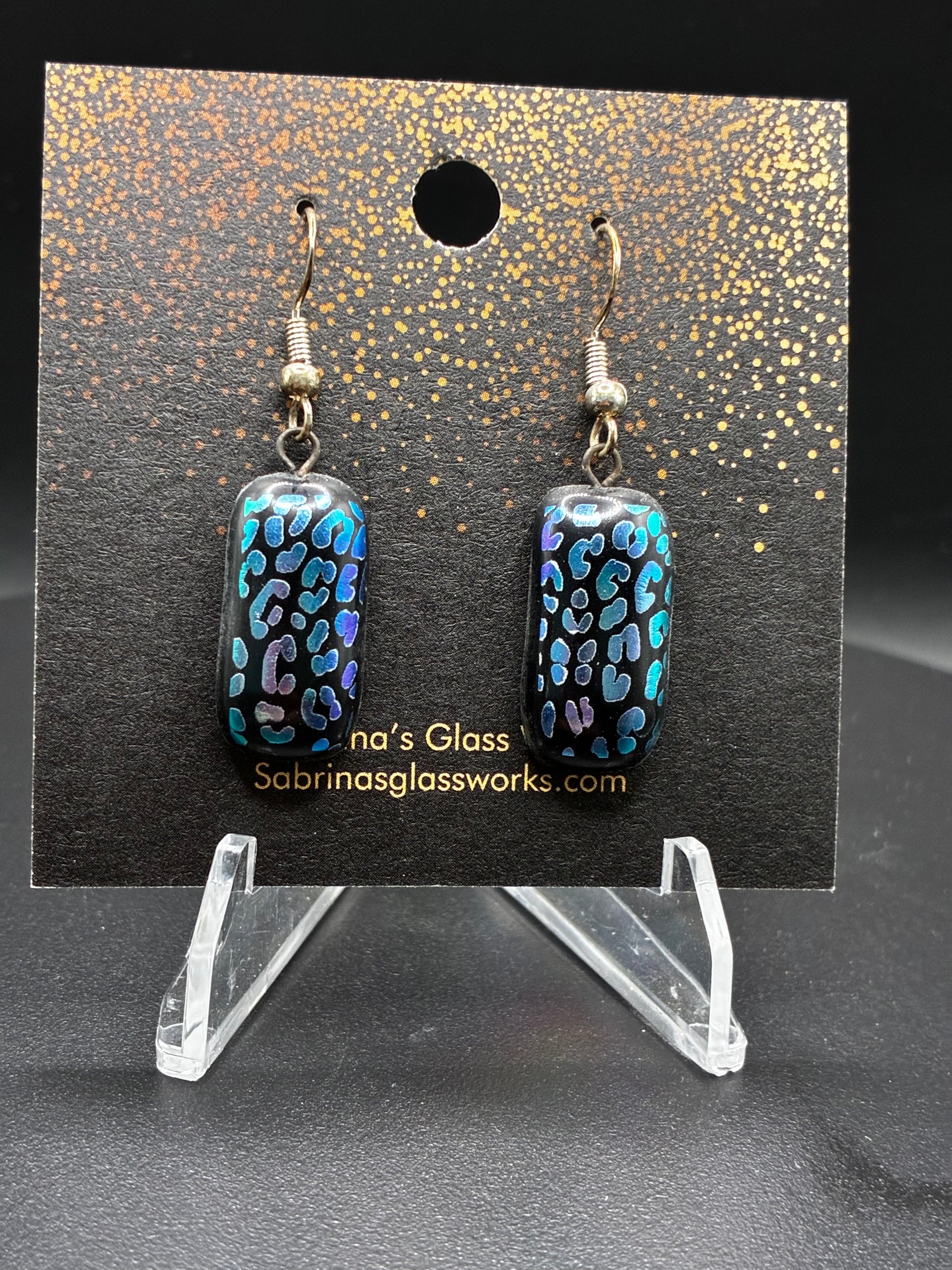 These earrings are a dazzling pair of rectangular dichroic glass pieces featuring a bold, modern blue and violet leopard-print pattern over a deep, glossy black background. The design combines the playfulness of animal print with the sophistication of fused glass artistry, creating a look that’s both edgy and elegant.