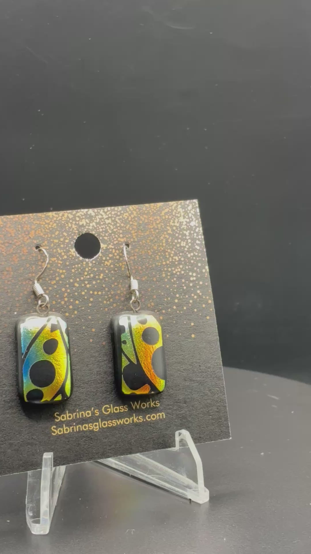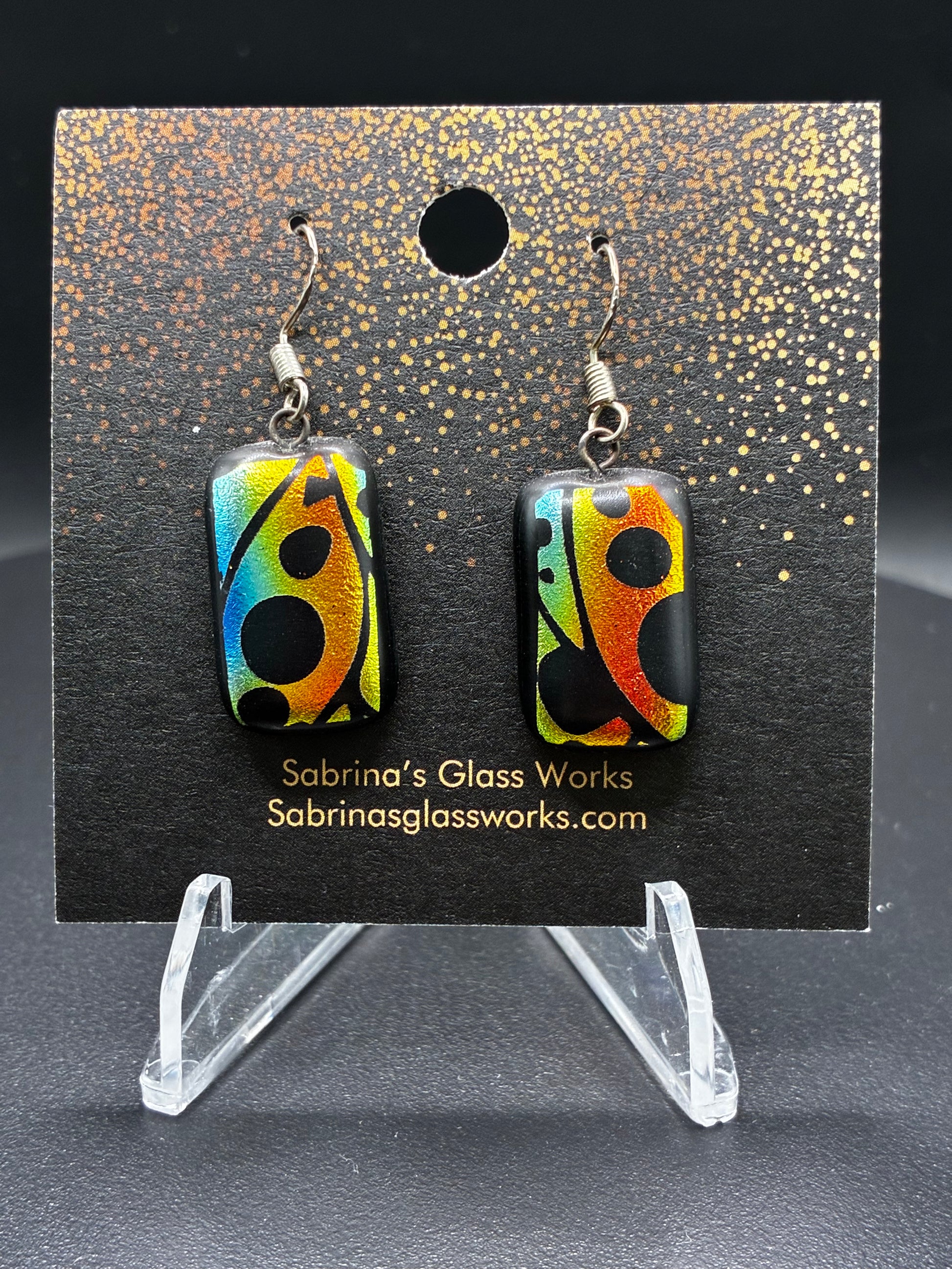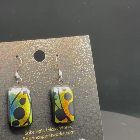 These earrings are a bold and luminous pair of rectangular dichroic glass pieces featuring a striking abstract design of large black circles and sweeping curves over a vivid, color-shifting background. The glass gleams with gold, copper, green, and blue tones that transform beautifully under different lighting—each movement revealing a new flash of iridescence.