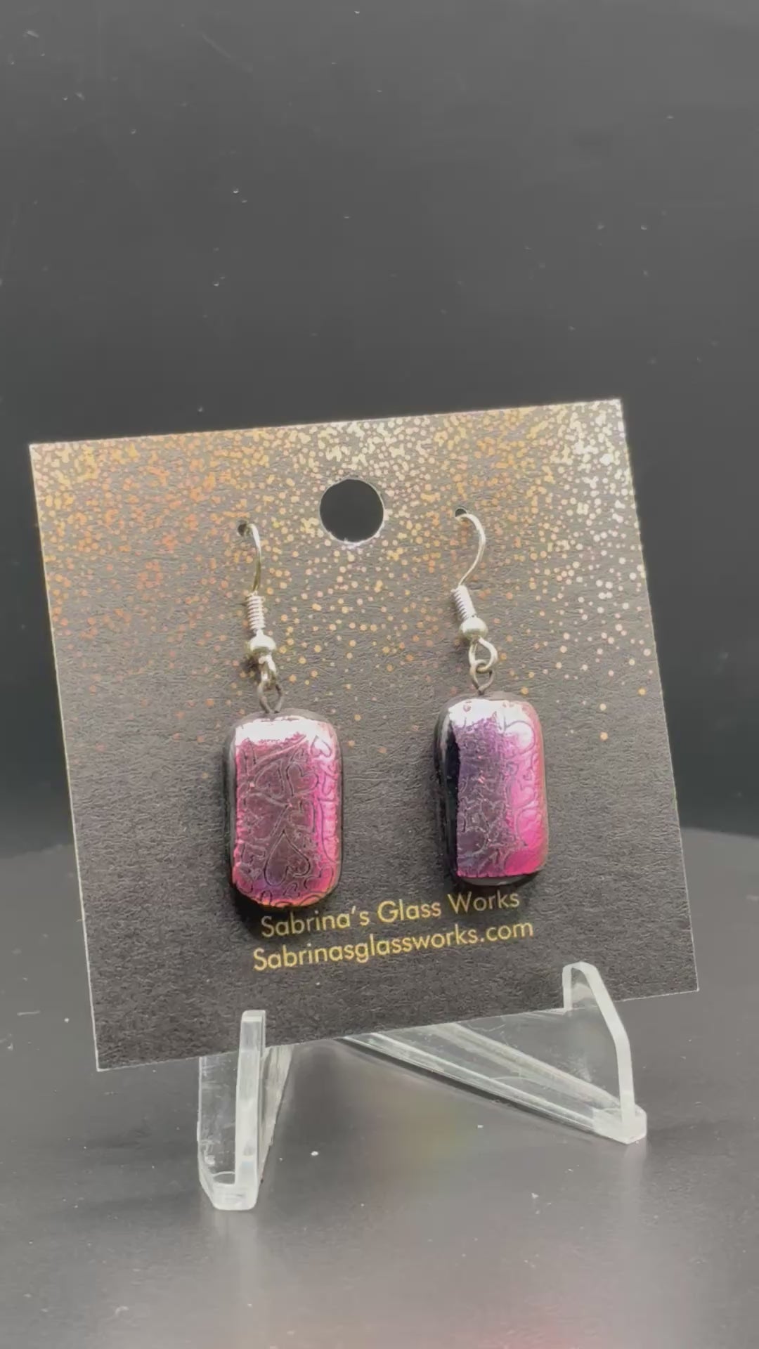 These earrings are a stunning pair of rectangular dichroic glass pieces that radiate a mesmerizing blend of magenta, fuchsia, and violet tones. Their surface shimmers with a silky metallic glow that shifts with the light, creating a rich, dimensional effect.