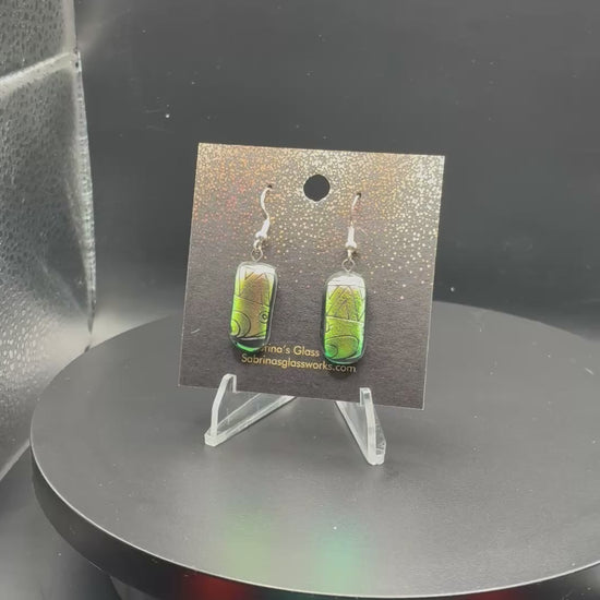 These earrings are a luminous pair of rectangular dichroic glass pieces that radiate vivid shades of golden yellow and emerald green, shifting beautifully as the light moves across them. The surface is decorated with abstract black linework—a modern, geometric pattern featuring soft arcs and angular shapes that give the design a sense of both structure and flow.