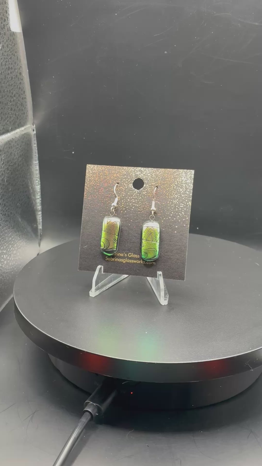 The deep black glass base enhances the intensity of the glowing green and gold tones, while the smooth, glossy finish brings out a mirror-like brilliance. Each earring has its own unique variation in the pattern, emphasizing the individuality of handmade fused glass art. They hang on sterling silver French hooks.