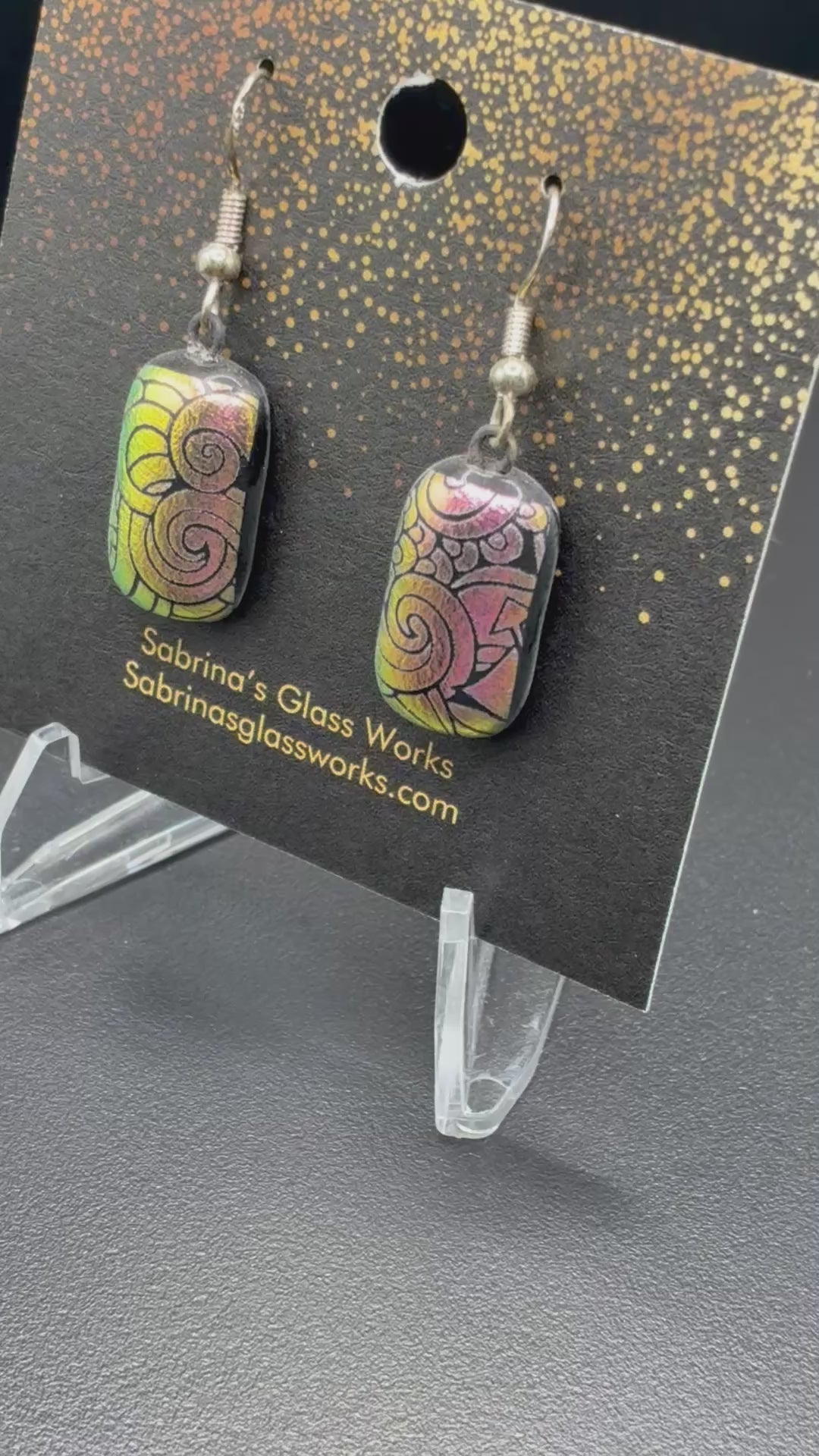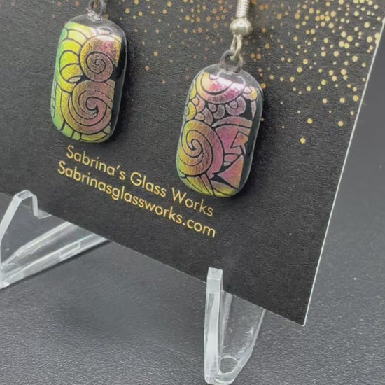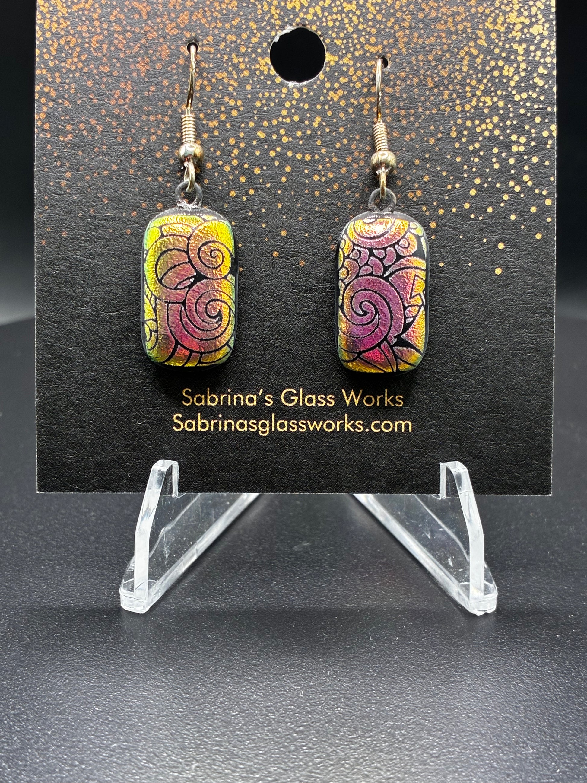 These earrings are a radiant pair of rectangular dichroic glass pieces that shimmer with brilliant shades of magenta, gold, and violet, creating a warm, sunset-like glow. The surface features intricate swirling patterns in black—spirals and curved lines that dance across the glass—adding a sense of movement and artistry to the design.