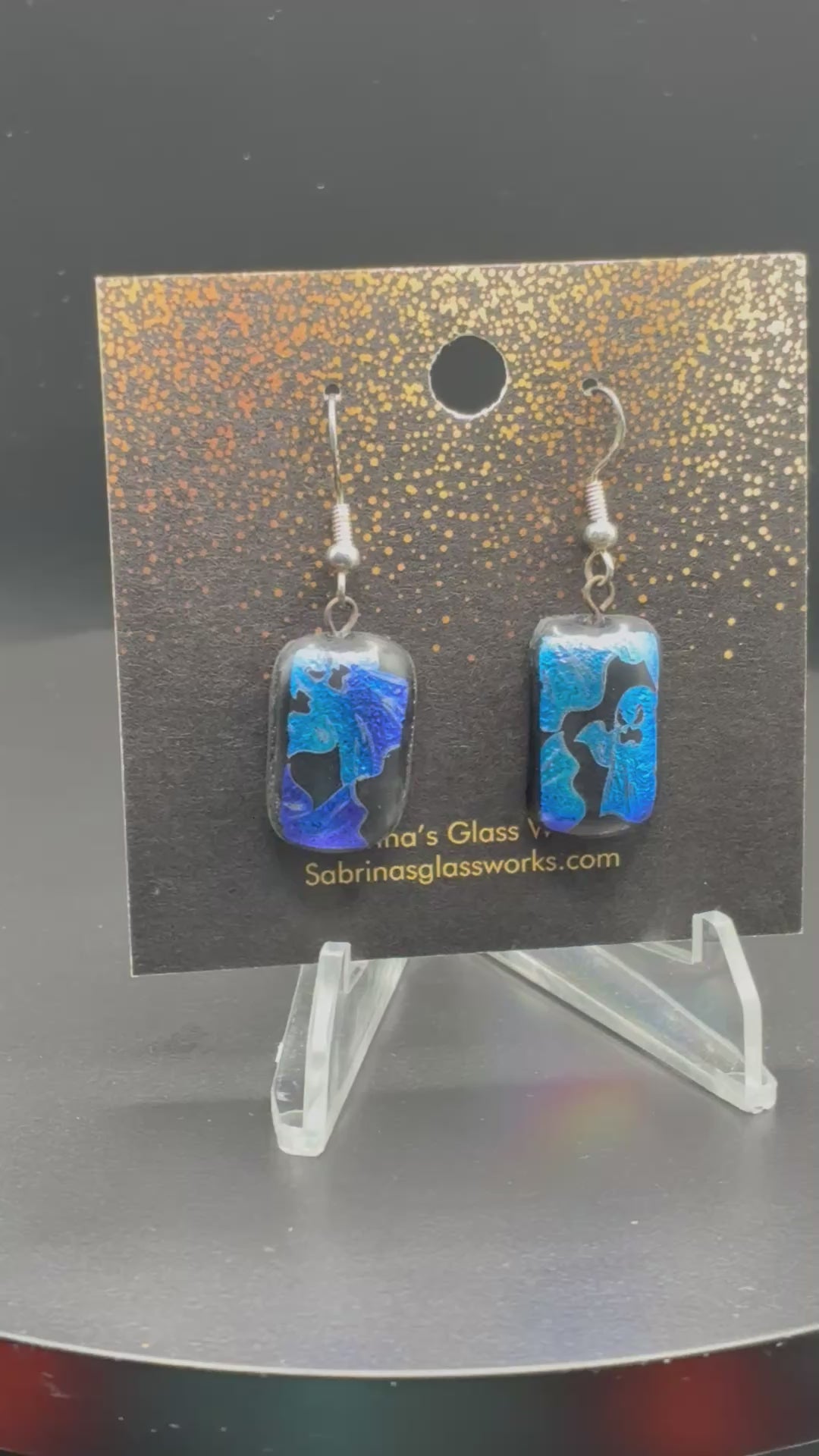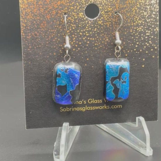 These earrings are a striking pair of dichroic glass rectangles with a deep, electric sapphire blue shimmer that dances across the surface when they catch the light. Each earring features a bold, organic pattern of Ghost flowing in the luminous blue against a black background.