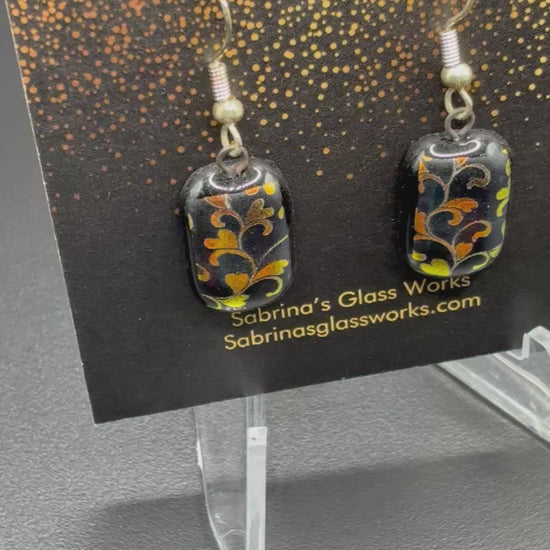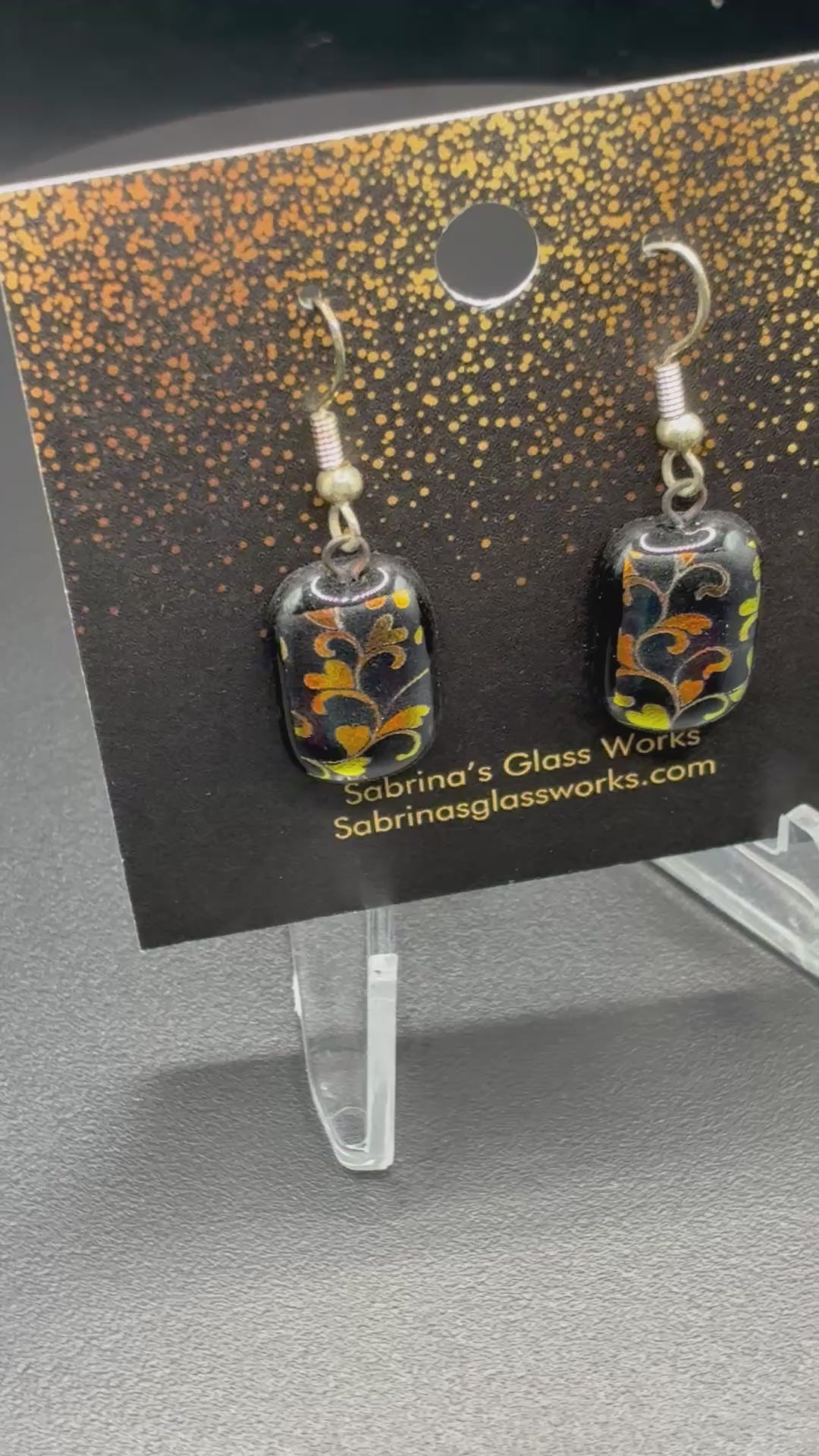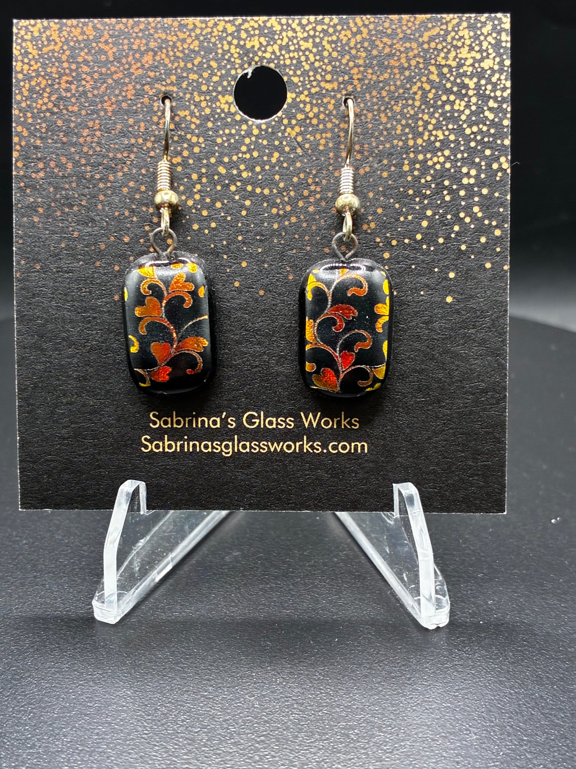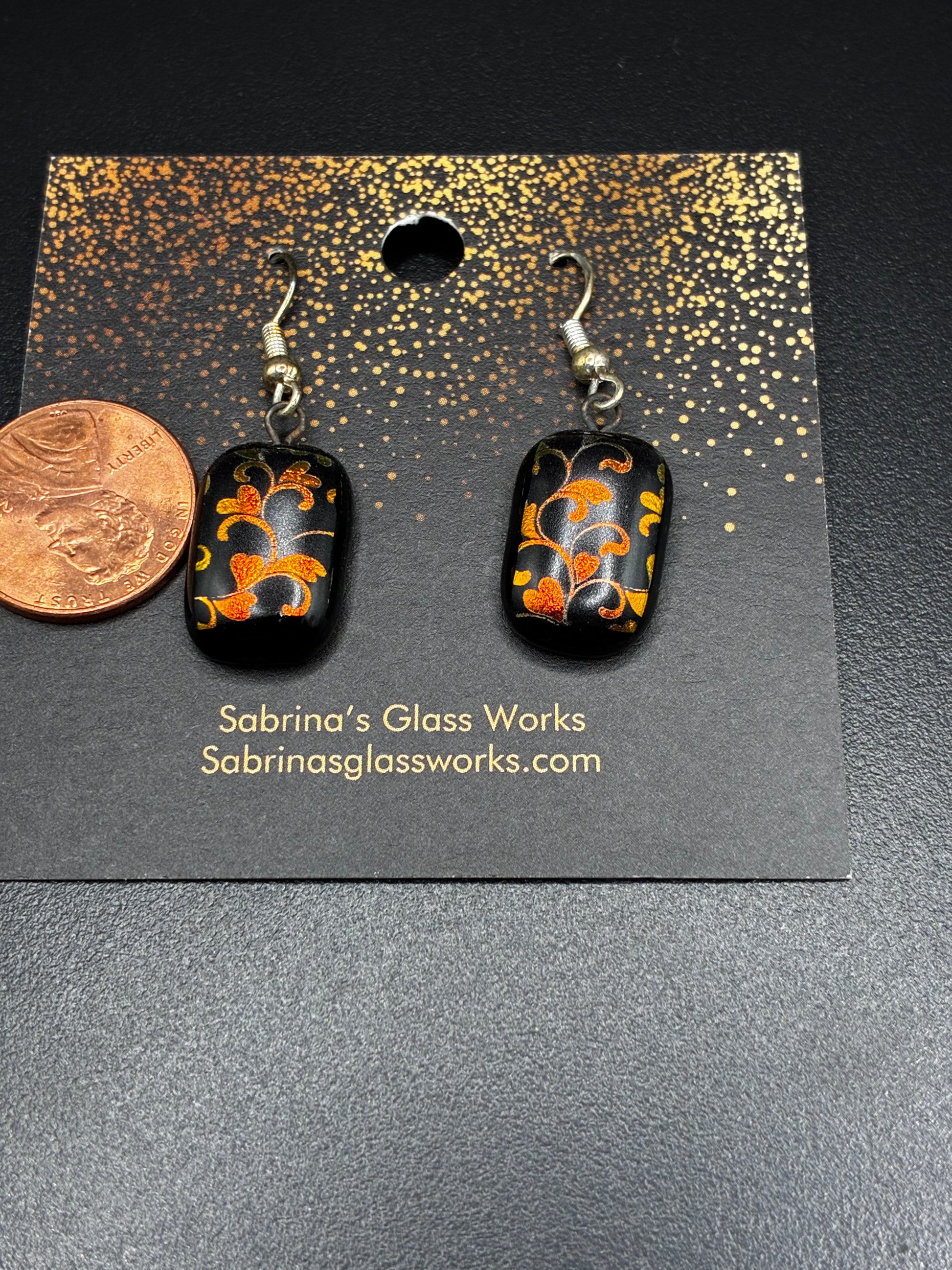 447-These earrings are an elegant and refined pair of handcrafted dichroic glass pieces from Sabrina’s Glass Works, featuring a sleek black base overlaid with a delicate pattern of metallic orange and gold scrolls and hearts.