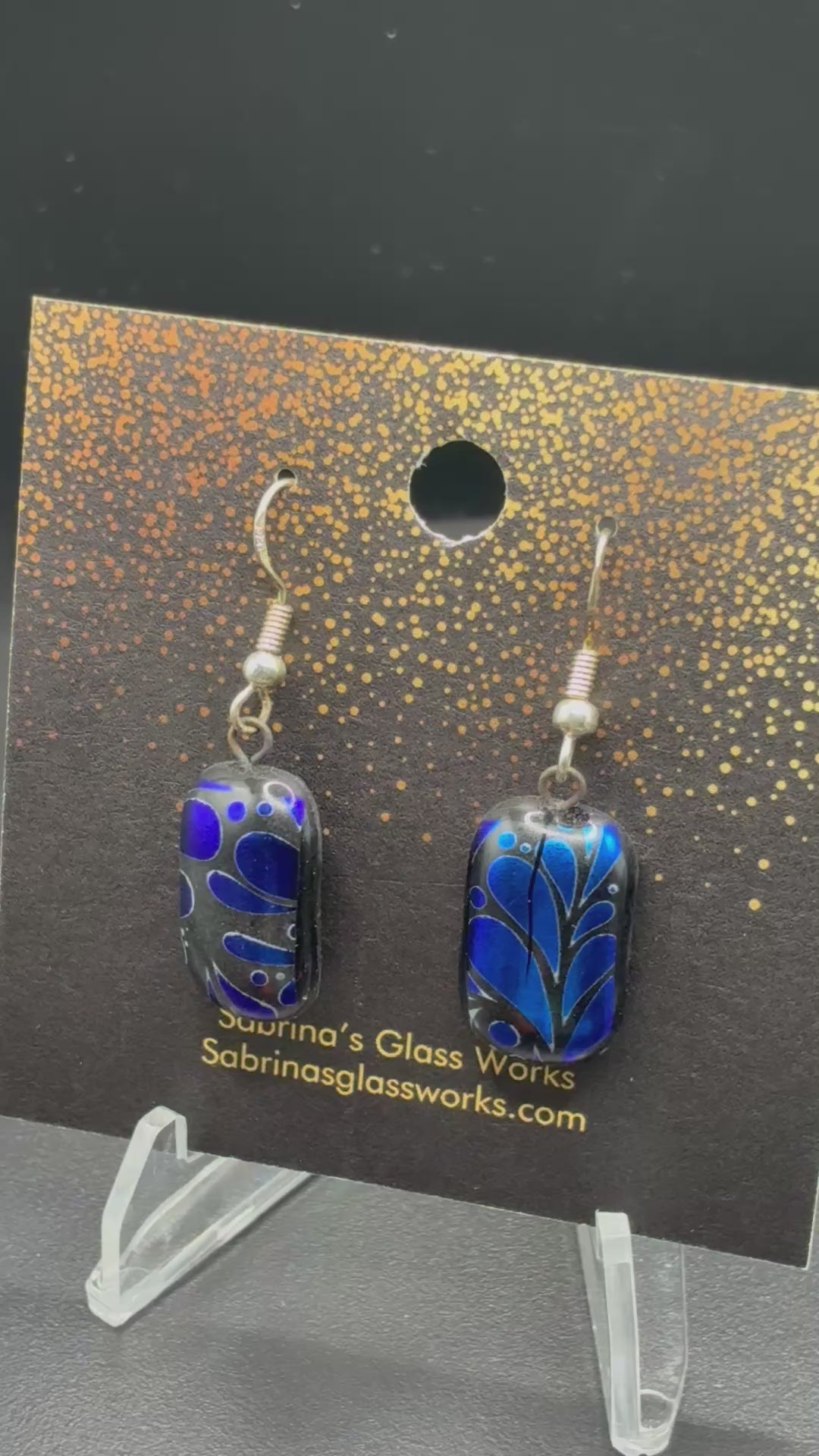 These earrings are a bold and luminous pair of handcrafted dichroic glass art pieces from Sabrina’s Glass Works, featuring a deep, mesmerizing cobalt blue that glows like liquid light against a sleek black background.