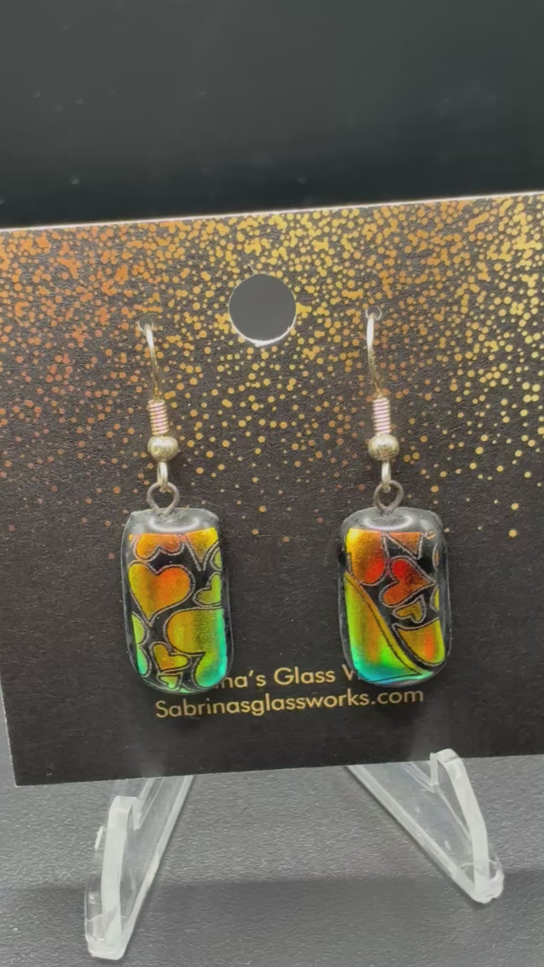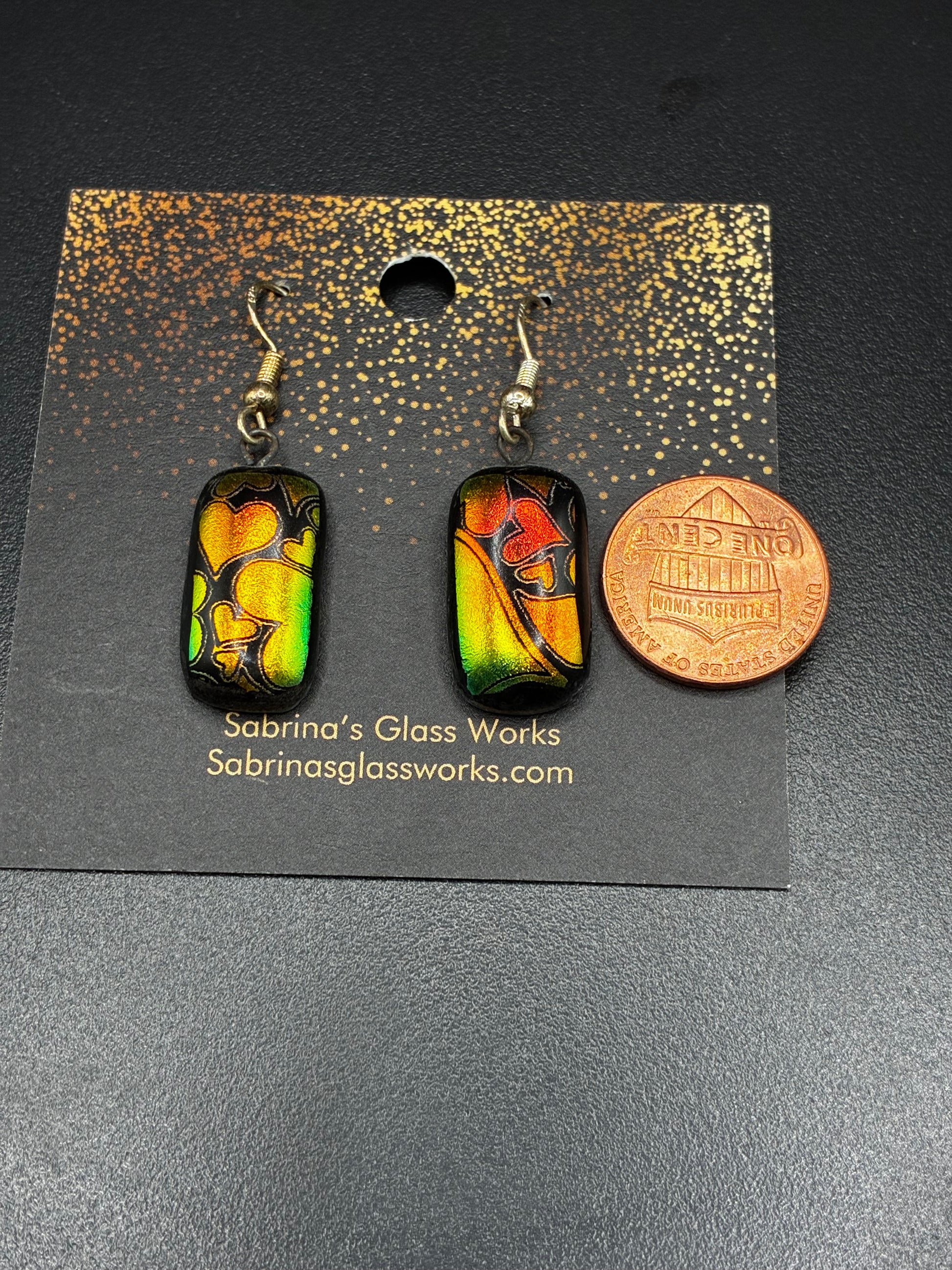 453-These earrings are a radiant pair of handcrafted dichroic glass creations from Sabrina’s Glass Works, glowing with sunset hues of gold, orange, and green that shift and shimmer as they catch the light.