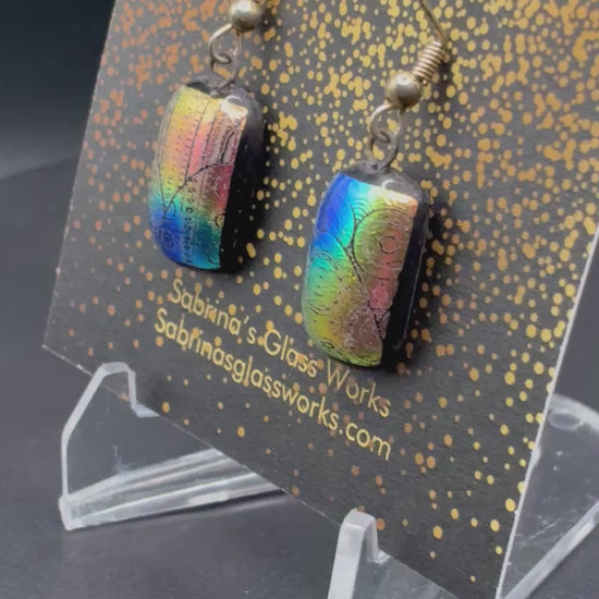 455-These earrings are a gorgeous fusion of vibrant jewel tones and intricate texture. Each rectangular glass piece shimmers with a gradient of dichroic color—ranging from rich sapphire blue to mossy green, into warm coppery gold and hints of deep red. The shifting hues create a mesmerizing, iridescent effect that changes with every movement.