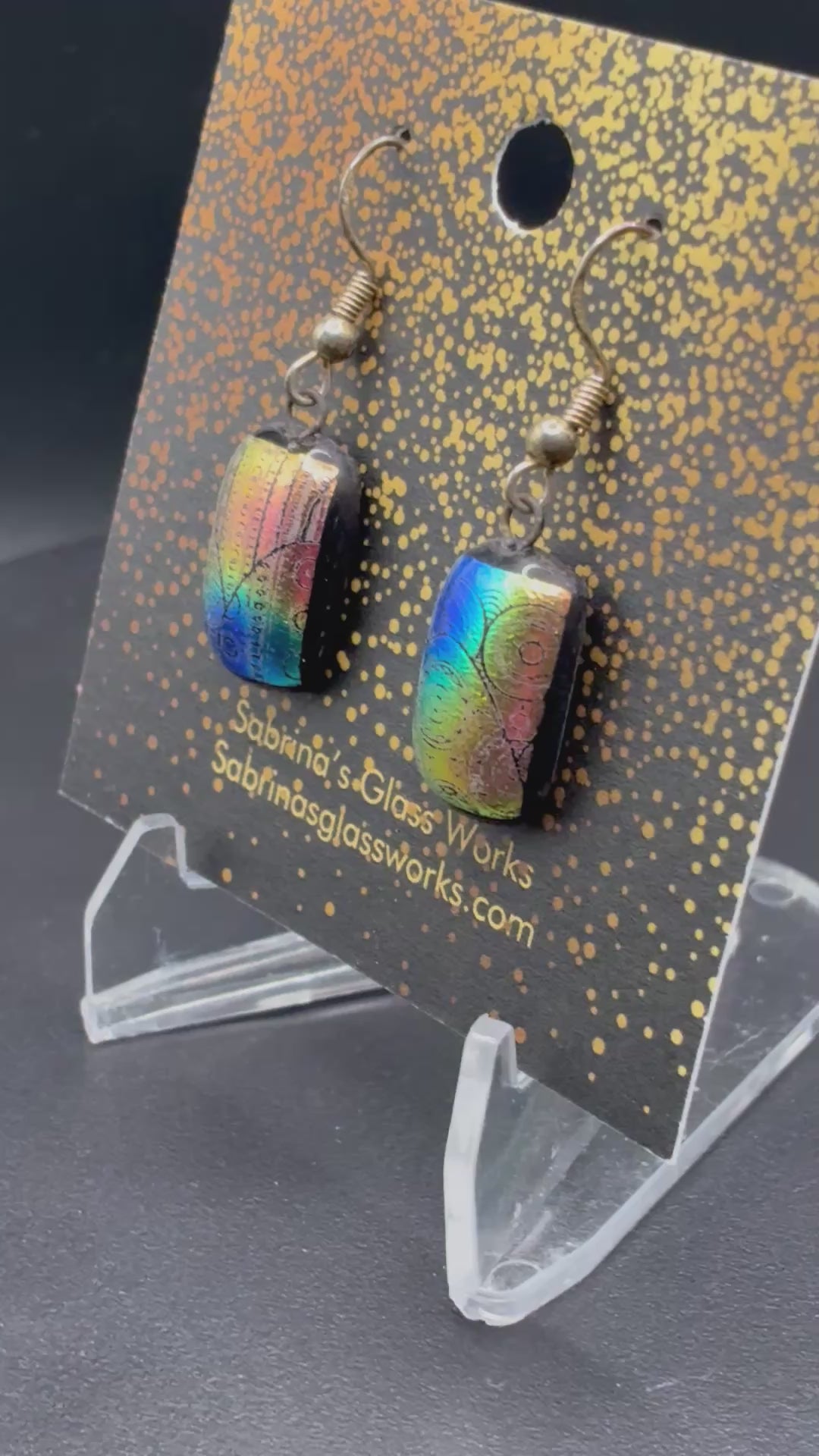 Embedded patterns add even more interest—delicate geometric impressions and organic swirls that give the surface a subtle artistic complexity. Paired with antique bronze-style hooks, they carry a warm, handcrafted charm that complements the luminous glass perfectly. They hang from sterling silver French hooks. Colors will vary due the nature of Dichroic glass.