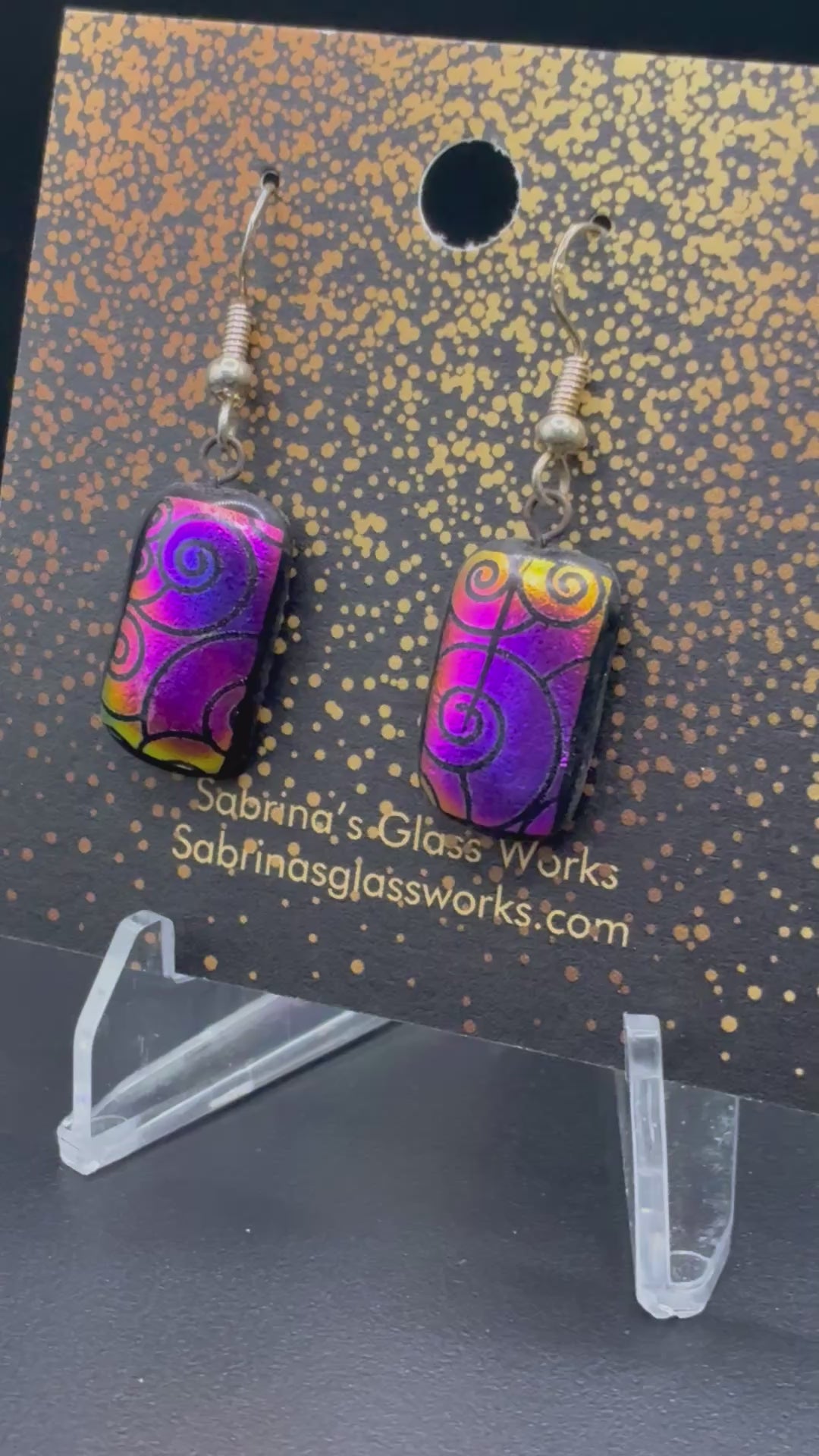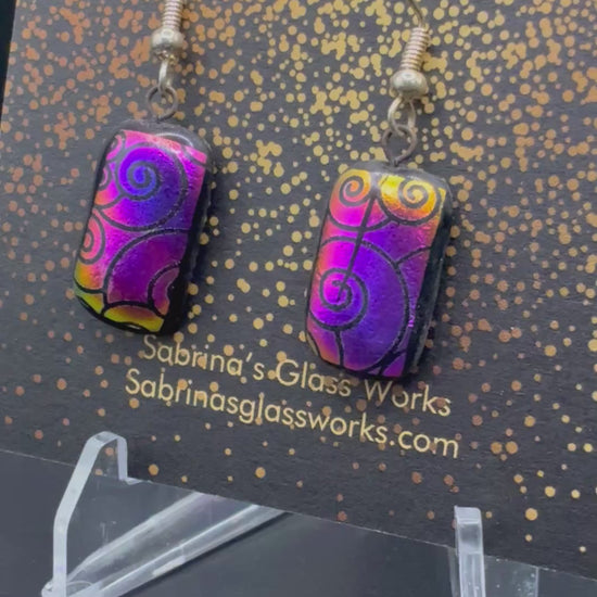 460-These earrings are radiant and full of energy — a beautiful fusion of color and movement. Each rectangular fused dichroic glass piece glows with a vivid gradient that shifts from deep magenta and violet at the center to warm golden amber at the edges. The surface is adorned with delicate black swirling patterns that dance across the glass, adding a sense of whimsical motion and artistry.