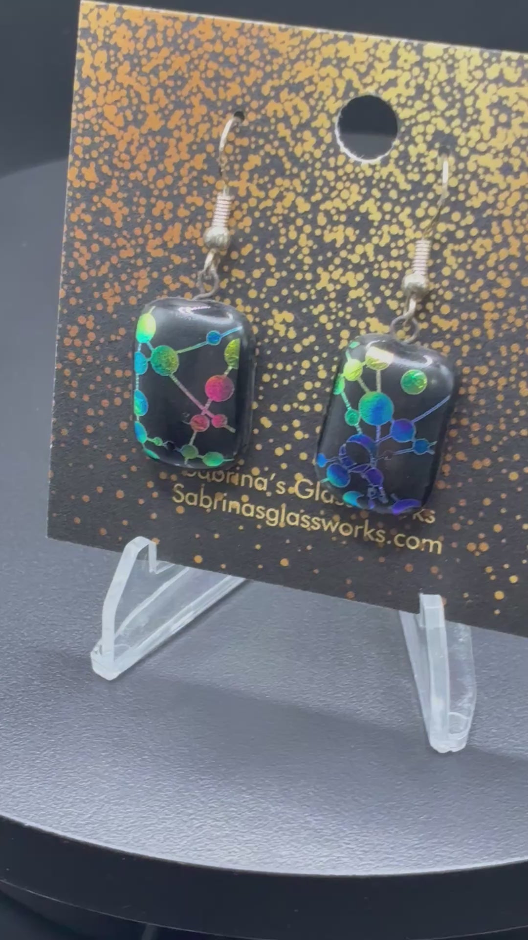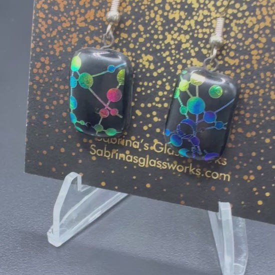 463-These earrings have a sleek, modern elegance with a playful, cosmic twist. Each rectangular fused dichroic glass piece features a glossy black background overlaid with a delicate network of iridescent circles and connecting lines — almost like a constellation or molecular pattern shimmering across the surface.
