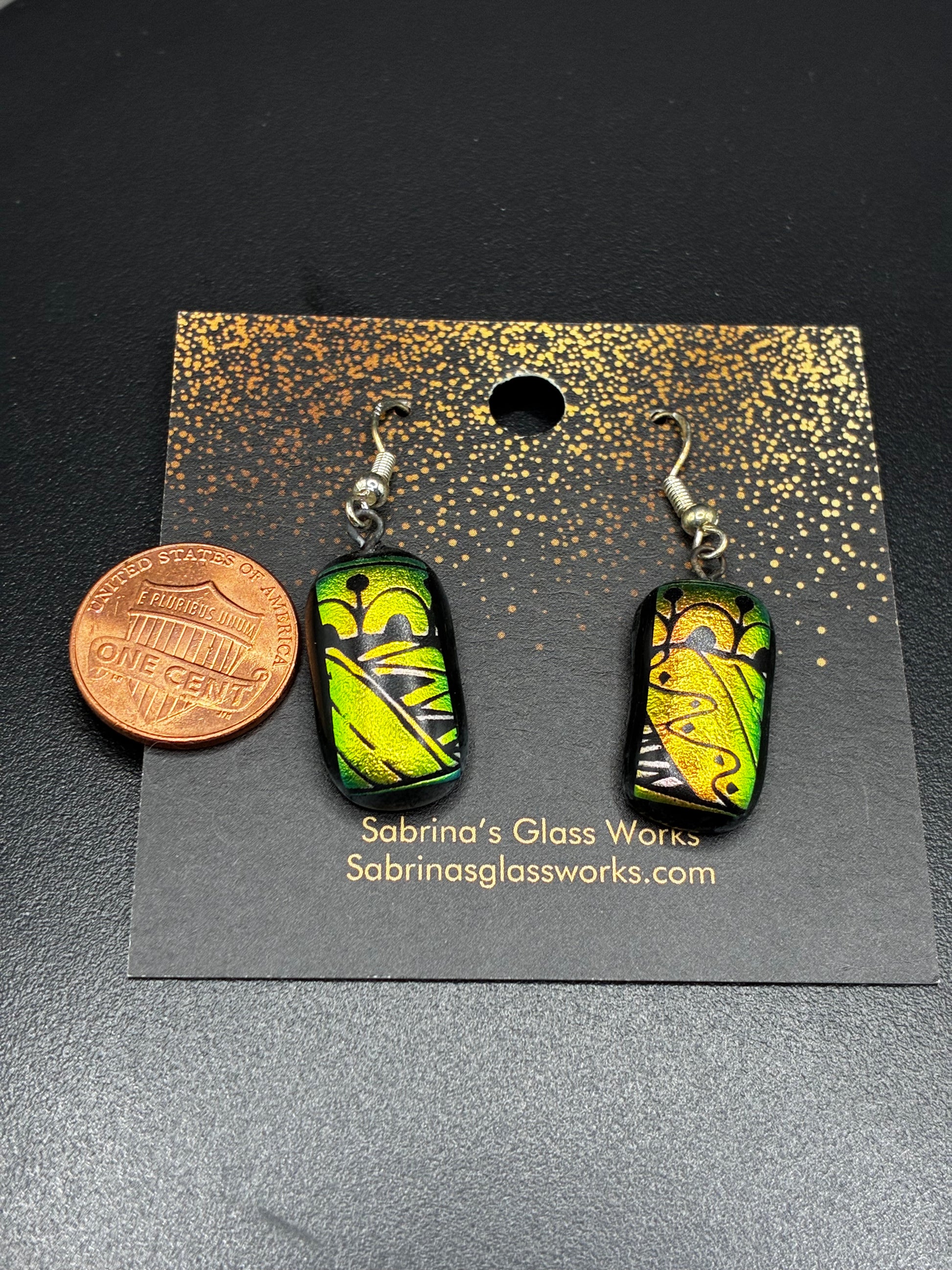 464-These earrings are a stunning pair of handmade dichroic glass designs from Sabrina’s Glass Works. Each rectangular earring features a brilliant gradient of metallic green and gold, accented with hints of amber and deep emerald that shift in the light.