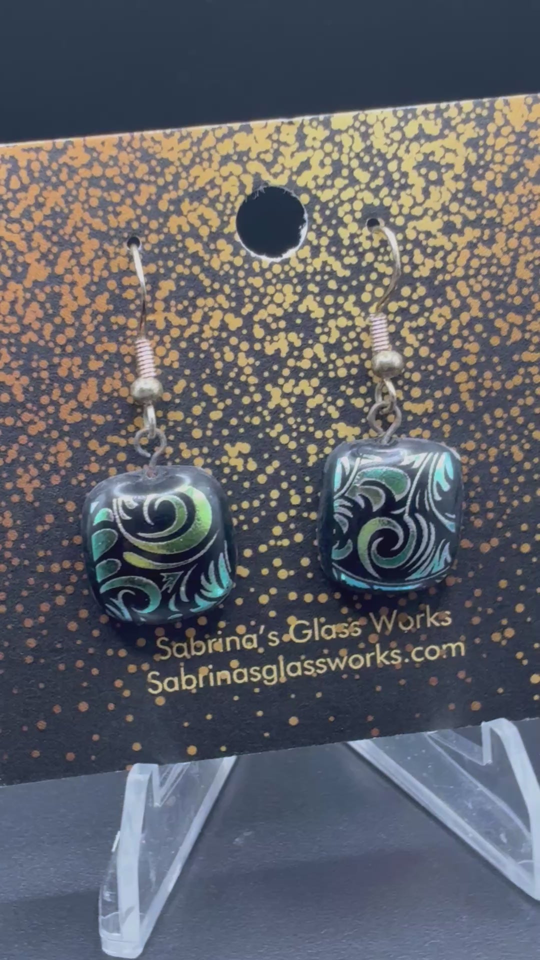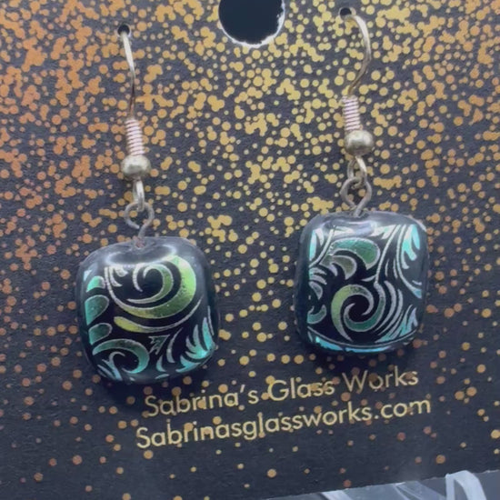 These earrings are handcrafted dichroic glass pieces with a sophisticated, artistic flair. Each earring features a rounded square glass cabochon displaying a swirling metallic pattern in silver and teal against a deep black base. The dichroic glass shimmers with hints of aqua and green tones, giving the design depth and movement as it catches the light.