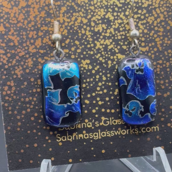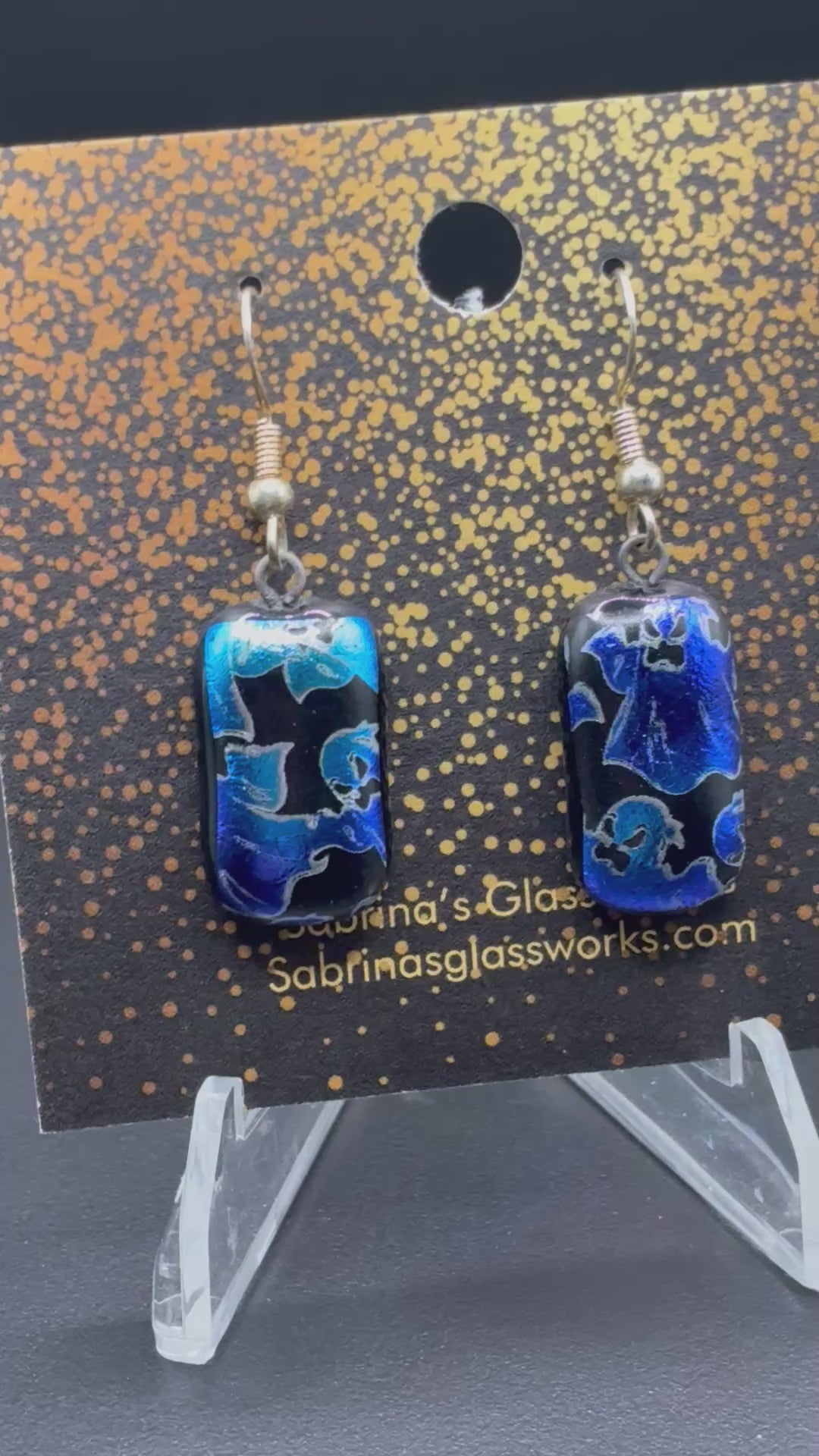 472-These earrings are rectangular dichroic glass pieces featuring a mesmerizing interplay of deep cobalt blue, turquoise, and black. The surface shimmers with a metallic, almost liquid-like luster, and the abstract pattern resembles waves or clouds drifting through a night sky. Each earring has its own unique organic design, giving the pair an artful, one-of-a-kind quality.