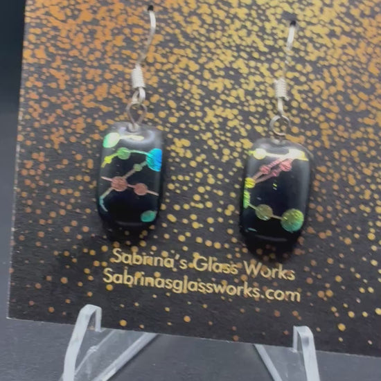 480-These earrings are a striking pair of fused glass art pieces—bold, modern, and richly detailed. Each rectangular glass cabochon features a deep black background that allows the shimmering accents to truly pop. The surface is decorated with iridescent dichroic dots and gently curving lines, creating a constellation-like pattern that feels both celestial and abstract. The colors shift under the light—greens, blues, and copper tones—giving the earrings a dynamic, multi-dimensional glow as they move. They hang from sterling silver French hooks. Colors will vary due to the nature of Dichroic glass.