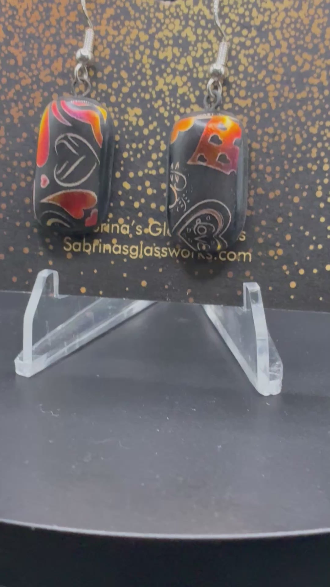 485-These stunning handcrafted dichroic glass earrings feature a sleek rectangular shape with a deep black base that makes the fiery metallic accents pop. Swirls, curves, and playful abstract shapes shimmer in rich tones of red, orange, and gold—creating a dynamic, one-of-a-kind design in each piece. The glass naturally catches the light, shifting in intensity as they move.