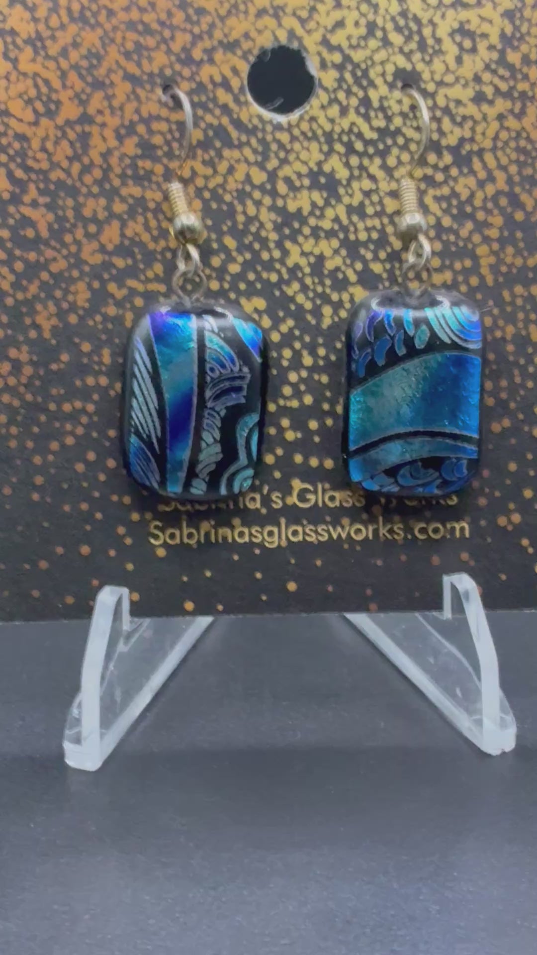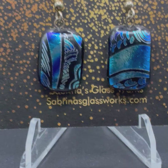 486-These earrings feature a striking and elegant fusion of deep cobalt, turquoise, and midnight blue dichroic glass with fluid, abstract patterns. Each piece has its own unique design — one with bold sweeping wave-like accents, the other with layered, ocean-inspired curves — giving them a perfectly coordinated yet intentionally mismatched artistic look.