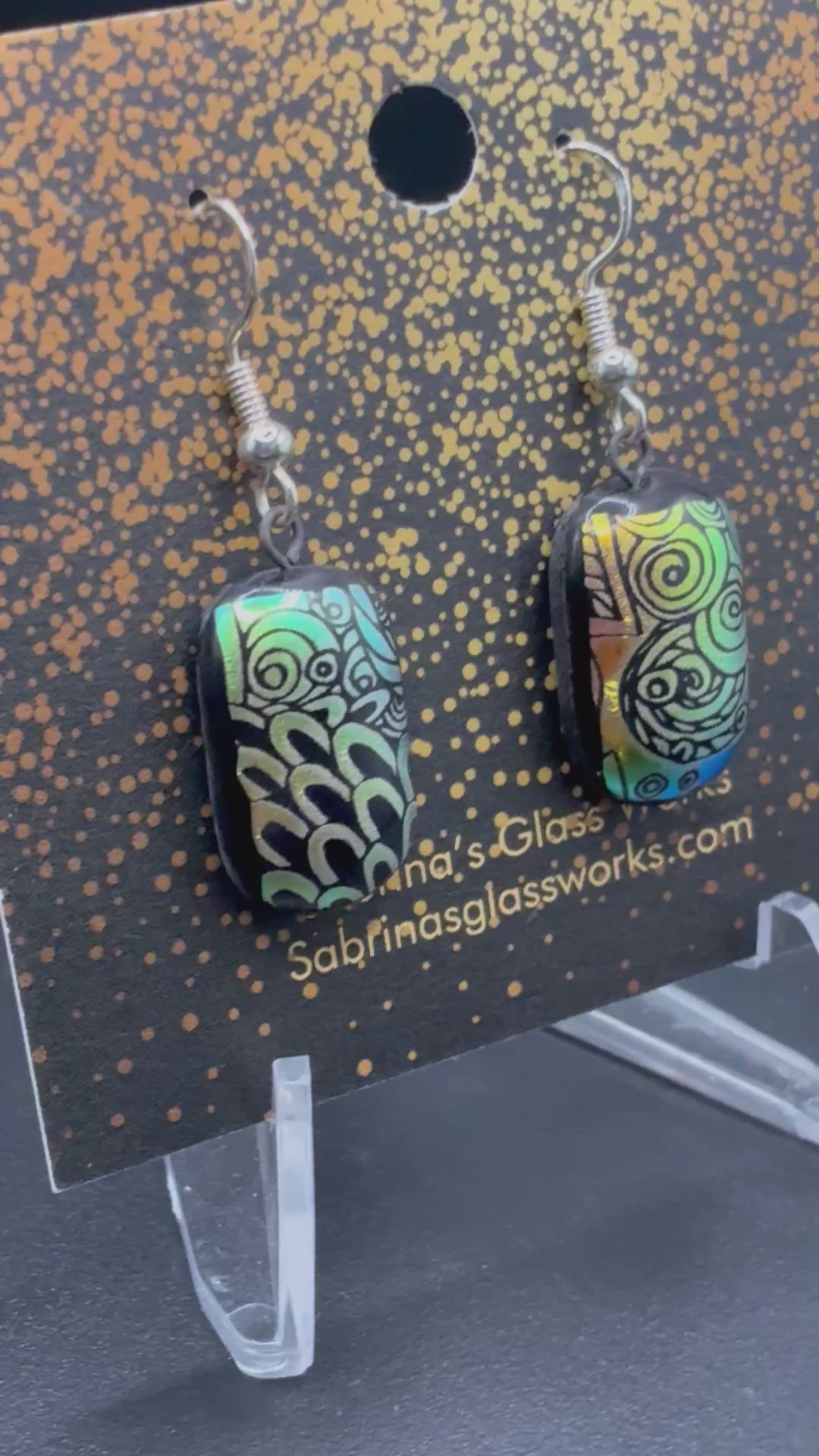 The dichroic finish produces a mesmerizing metallic iridescence, shifting color as the light moves — from soft seafoam and turquoise to golden amber tones. The glass has a smooth, polished surface, enhancing both the luster and the fine details of the pattern. They hang from sterling silver French hooks. Colors will vary due to the nature of Dichroic glass.