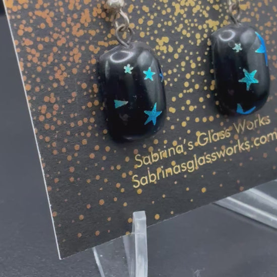 These earrings feature a sleek, modern look with a touch of celestial magic. Each piece is a glossy black fused-glass rectangle with smooth, rounded edges, creating a polished and sophisticated look.