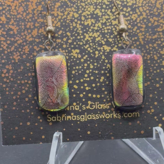 499-These earrings showcase a warm, fiery elegance with a beautifully textured fused glass design. Each rectangular piece features a shimmering blend of metallic hues—golds, coppers, deep reds, and touches of green—creating a sunset-like shift of color as they catch the light. The surface has a subtle embossed pattern, adding depth and a tactile artistry to the glass. Each pair hangs from sterling silver French hooks. Colors will vary due to the nature of the glass.