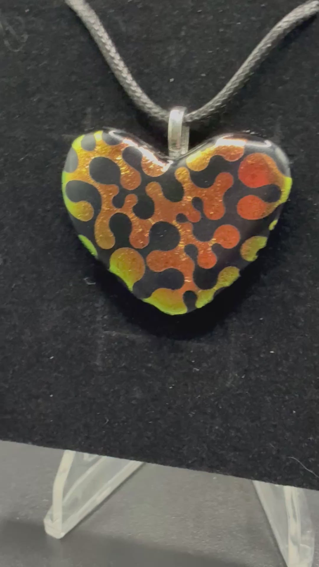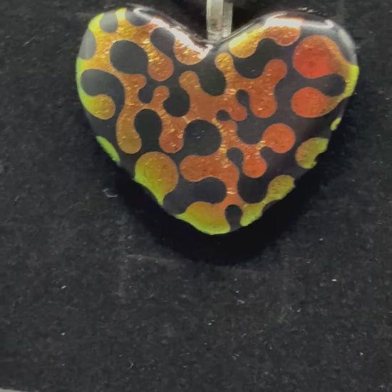 features a bold, modern pattern reminiscent of flowing lava. Swirls of fiery orange, red, and golden-yellow dichroic glass shift beautifully in the light, set against a deep black background for maximum contrast. The glossy surface enhances its shine and dimension, while the abstract organic shapes give it a lively, contemporary feel.