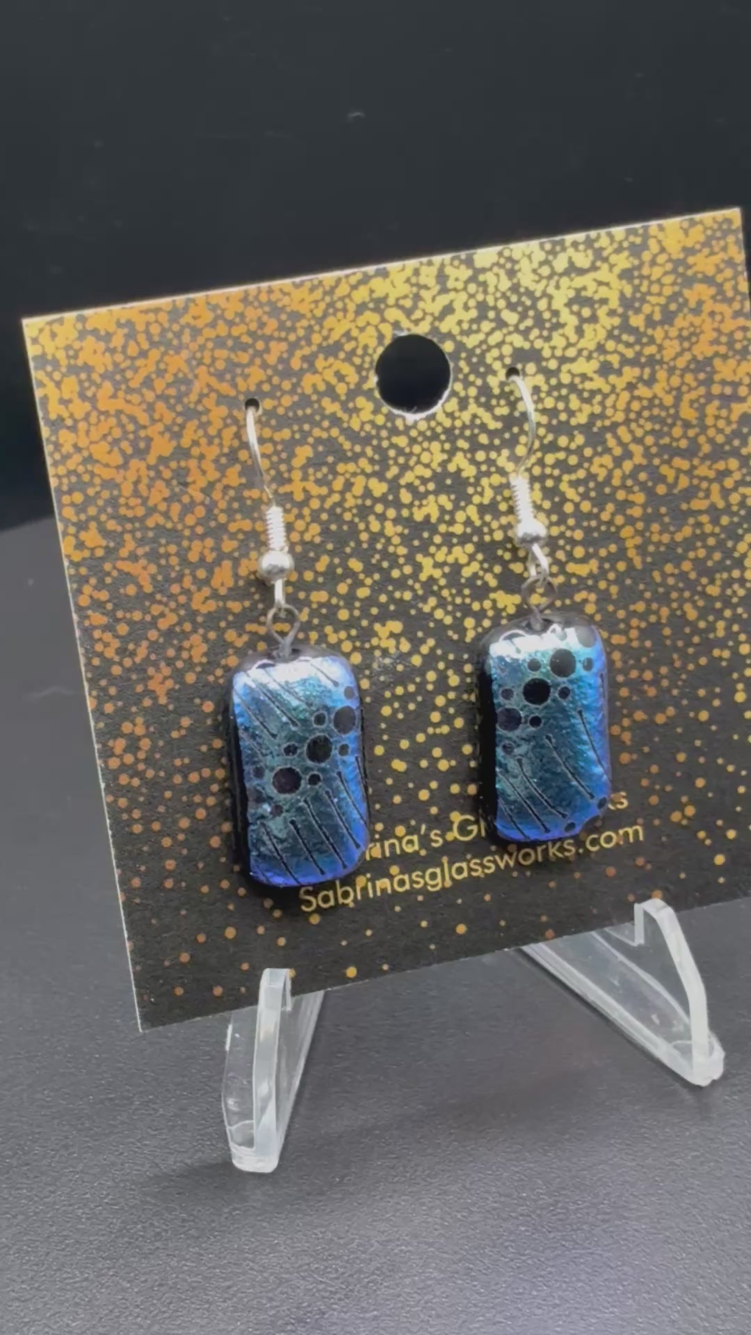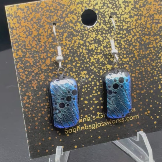 These earrings feature striking rectangular fused dichroic glass pieces with a vivid blue base that shimmers with metallic depth. The surface design includes abstract black circular and line patterns, giving them a contemporary, almost cosmic energy—like constellations against a deep, iridescent sky.