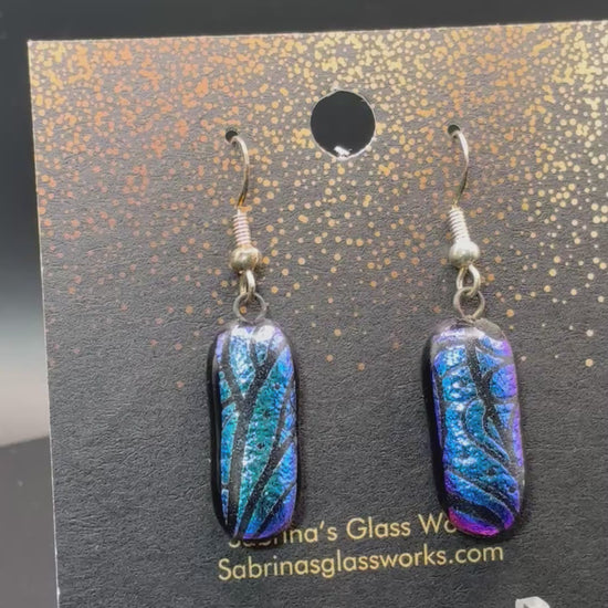 These earrings are handcrafted dichroic glass pieces with a sleek, rectangular drop design. Each earring shimmers in vibrant shades of electric blue and deep violet, accented by fluid black wave-like patterns that give them an organic, flowing feel. The surface catches and reflects light beautifully, shifting between tones of blue, purple, and teal depending on the angle.